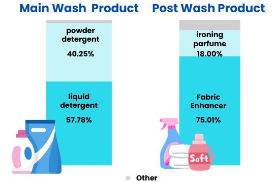 Nearly 60% of main wash purchases are in liquid detergent, making it the most preferred type among consumers. For post wash category as a laundry adds-on, Fabric Enhancers remain the most commonly used product by consumers.