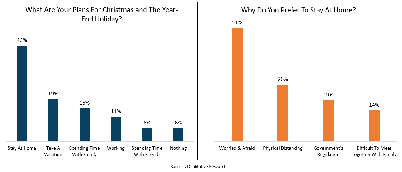 Most of the respondents (43%) chose to spend this year-end holiday by staying at home because they worried about another wave of Covid-19 cases and found it difficult to take a vacation because of the regulation set by the government. But in contrast to 19% of the other respondents' plans, they will take a vacation at the end of the year.