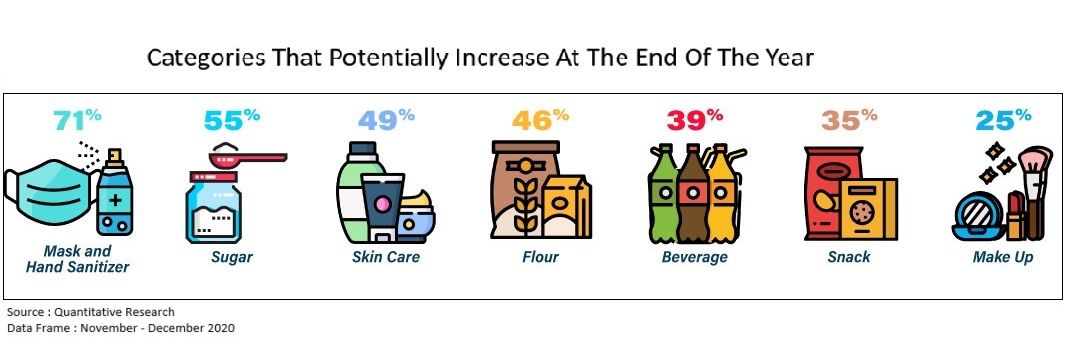 Now, let's dive into the categories in the minimarket that experienced an increase at the end of last year. The top 5 categories that potentially increase at the end of the year are the mask, hand sanitizer, sugar, skincare, flour, and beverages.