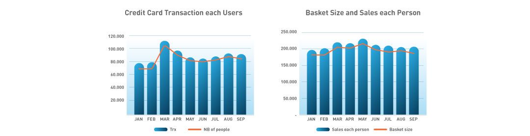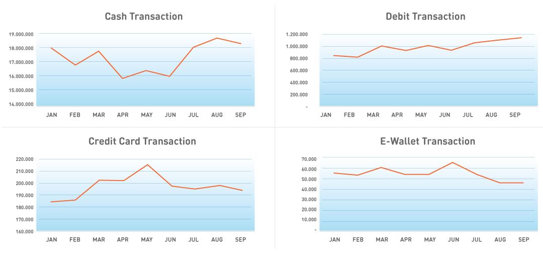 The number of credit card users reached peak on April, yet have declining trends on following months. Implementation of PSBB in April – May which made shopping centers and offices closed (mostly doing WFH), decreased the credit card transaction volume. Then even though credit card transaction was increased in June – September, but the volume is still lower than before PSBB period. It indicates people still “wait and see” on the situation.