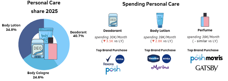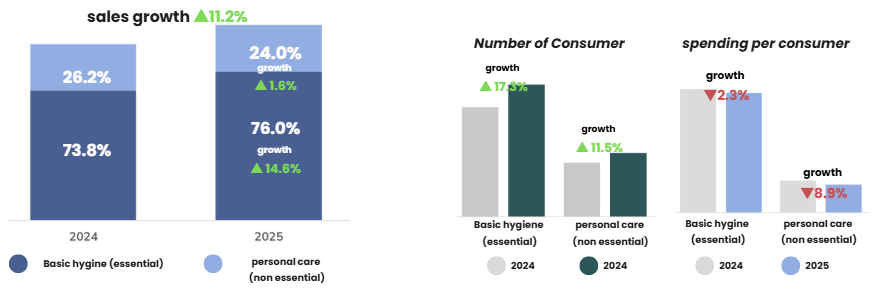 Total sales of men’s daily care products saw an overall increase of 11.2% . However, this growth was mainly driven by a rise in sales of hygiene essentials products, while personal care items grew at a much slower pace. As a result, personal care products experienced a drop in market share by 2.2% in 2025. The slow growth of personal care products can be attributed to a decline in consumer spending, which fell by 8.9%.