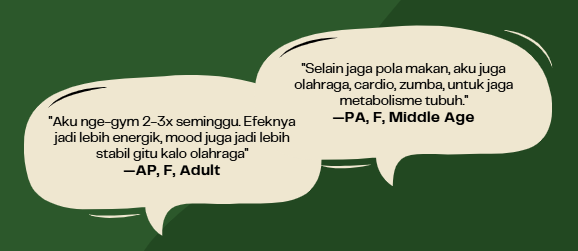 Besides maintaining their daily consumption, they also engage in various exercises. The majority of respondents have incorporated physical exercise into their routine, typically 2-3 times a week, as they believe it helps manage weight, reduce the risk of disease, and enhance their ability to perform daily activities.
