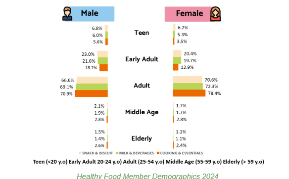When analyzing healthy product purchases by gender and age, we found that adult females tend to buy more snacks and biscuits, while older adult females are more likely to purchase cooking products and essentials.
