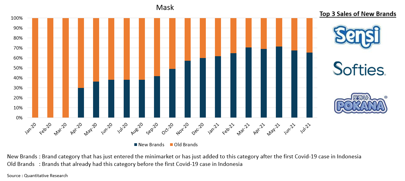 One of the essential items during the pandemic is a mask. Masks become simple yet effective protection to prevent the spread of the virus. Several new brands saw this opportunity and entered the minimarket channel in April 2020. Since then, sales of masks in minimarkets have been dominated by new brands.