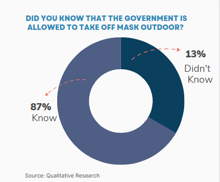 Based on a PT Global Loyalty Indonesia survey, 87% of people know that the government allows masks outdoors. However, there are two different views, 47% of people fear that other virus variants will appear on June 6, 2022, [2] has entered and confirmed positive for New Variant Omicron BA.4 and BA.5 in Indonesia. Meanwhile, 45% of people feel happy because when the government allows them to take off their masks outdoors, it means the pandemic is improving or more controlled.