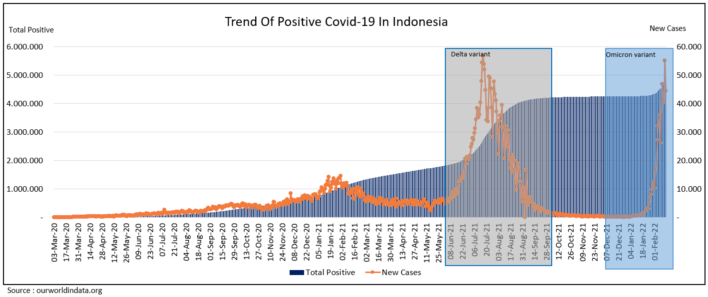 The number of positive cases of Covid-19 in Indonesia increased significantly in February 2022 due to the new variant called Omicron. As a result, there was the addition of 44,526 positive cases, bringing the total to 4,807,778 positive cases of Covid-19 as of March 2021.