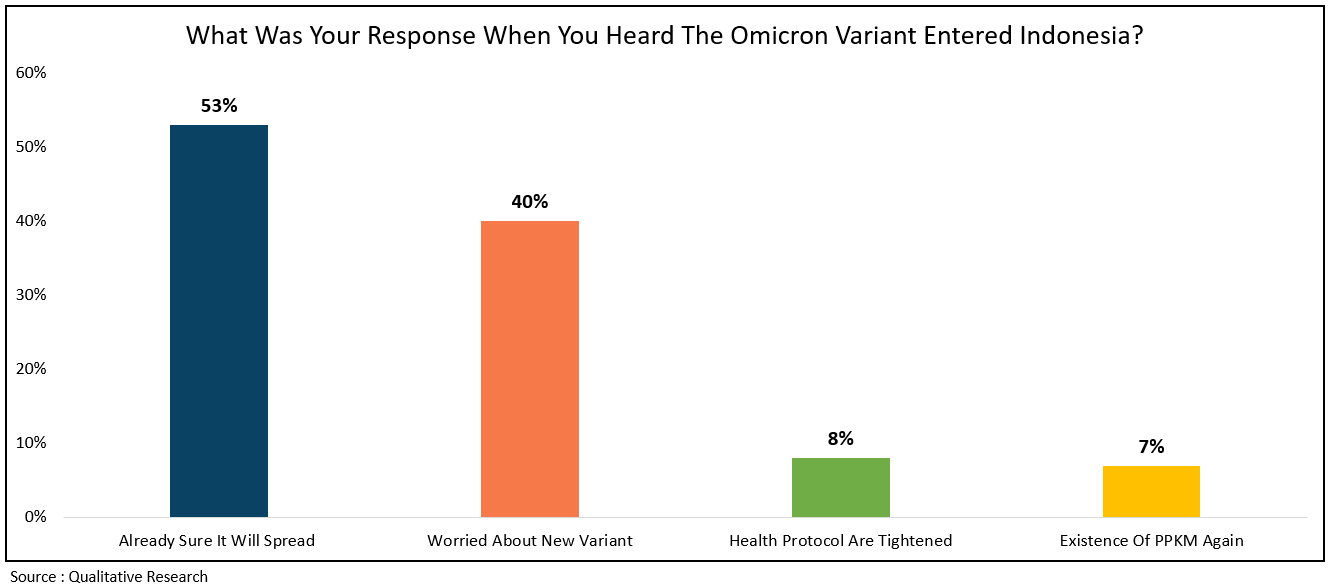 The omicron variant can affect someone who has been vaccinated but with mild symptoms or without any symptoms. Then, how does the public respond to this new variant? When the public heard that Omicron had entered Indonesia, the majority (53%) already felt used to it because, at this time, we have entered our third year with the pandemic. However, 40% of the respondents are worried about the new variant.