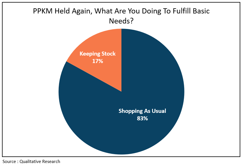 And with the rise of Covid-19 cases in Indonesia, the government has again implemented the Community Activity Restriction (PPKM) system, especially for cities with high case numbers. As a result, working activity will slow down again, and of course, this situation will affect decreasing income for certain people. Furthermore, in terms of meeting daily basic needs, 83% of the people choose to shop as usual and do not keep supplies because PPKM affects their income, and they are already used to the situation. Another 17% of people choose the stock up on groceries to reduce mobility.