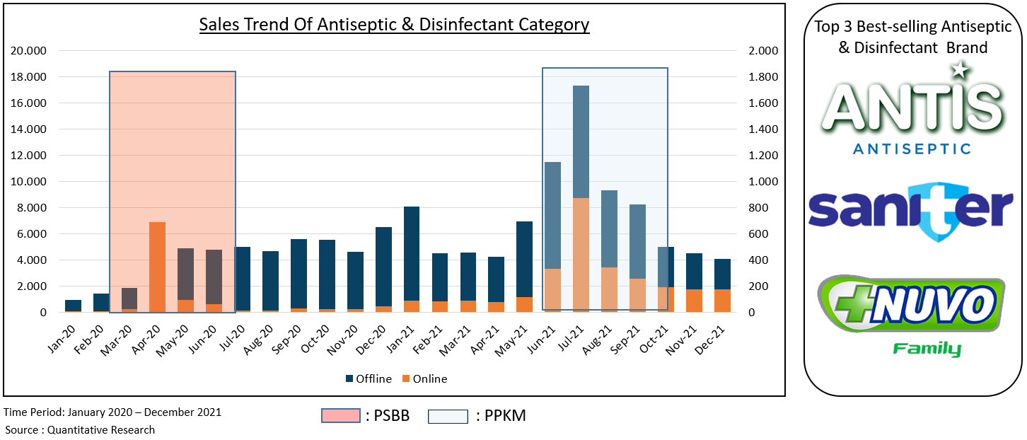 Like the vitamin and medicine category, the antiseptic and disinfectant category also shows significant sales growth during PSBB and PPKM. And for the top 3 best-selling antiseptic & disinfectant brands are led by Antis, Saniter, and Nuvo.