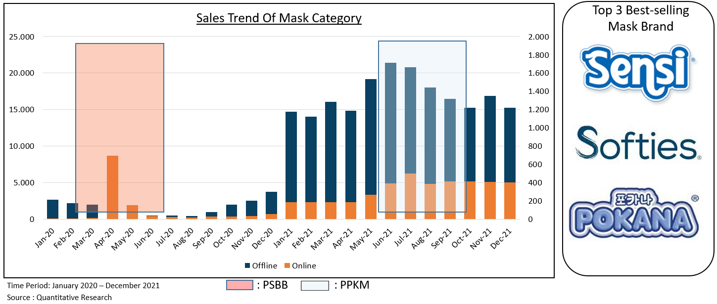 Last but not least, we have a mask category. One of the essential items during the pandemic is a mask. Masks become simple yet effective protection to prevent us from contracting the virus. Unfortunately, in 2020, we faced the scarcity condition of the mask caused by production issues that can't catch up with the demand in the market. However, in 2021, the mask supplies no longer became an issue. As a result, the sales increased significantly in 2021 and were dominated by offline transactions. Furthermore, the top 3 best-selling mask brands are led by Sensi, Softies, and Pokana.
