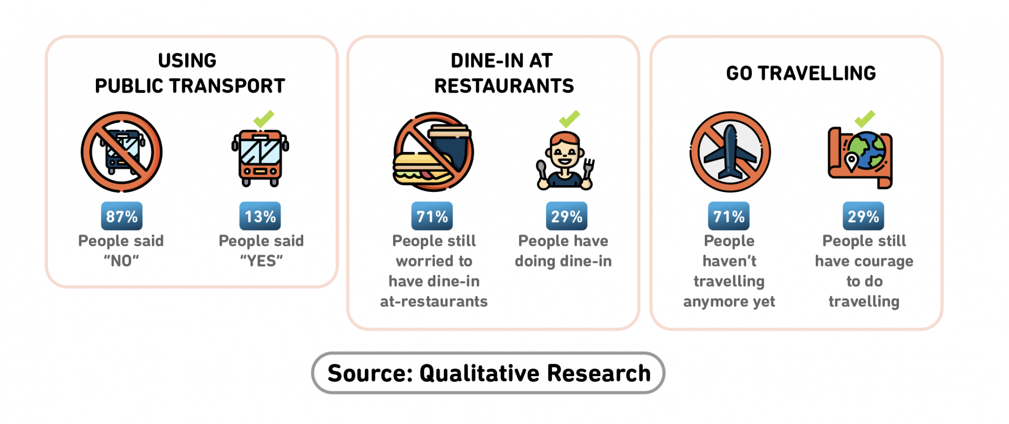 Using public transportation still been avoided by 87% of people. People still thinking that public transportation could be the media of spreading of the virus. Meanwhile Dine-in at restaurants and travelling activities were more acceptable, which 29% of people have no problem by doing those things to refresh their minds.