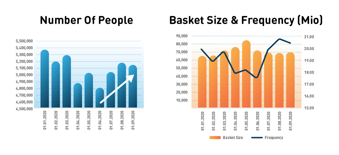 With less worries about Covid-19 and the urges to fulfill daily needs of grocery, people are now increased their shopping activities in minimarkets, proven by the increase of number of consumers and their frequencies. Previously, in initial PSBB period, people were tends to buy groceries in large basket size and very low frequency to minimarkets, but now it seems approaching the normal situation. Frequency of transaction was growing since june, followed by slightly increment of basket size in september.