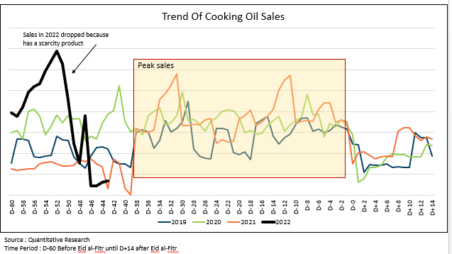 The trend of cooking oil sales for the last three years (2019-2021), has the same pattern during Eid al-Fitr which the peak sales happened from D-38 until D+2 Eid al-Fitr. However, there is a different pattern in 2022, the peak sales of cooking oil happened D-55 Eid al-Fitr because the government subsidizes the cooking oil[¹], the demand increased significantly meanwhile the supply is limited in the market and this condition caused a scarcity of cooking oil. In addition, as reported by Detik News[²], Kasatgas Pangan Polri Irjen Helmy Santika explained that the scarcity of cooking oil is also caused by wholesale action and stock holding in amounts above the average monthly requirement resold by resellers or speculators at prices above the provisions.