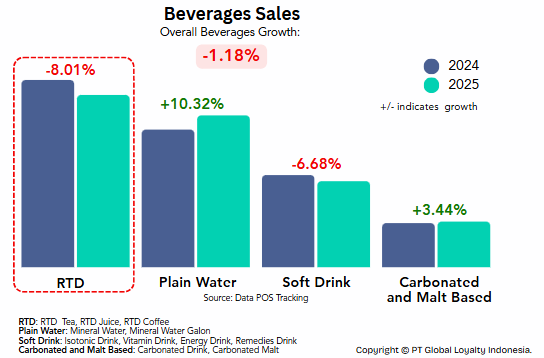 Based on transaction data, beverage sales experienced a slight decline, driven by a decrease in RTD sales — which contributed the most to total beverage sales. The RTD category includes RTD Tea, RTD Juice, and RTD Coffee. In contrast, Plain Water — which includes bottled and gallon mineral water — showed notable sales growth of 10%.