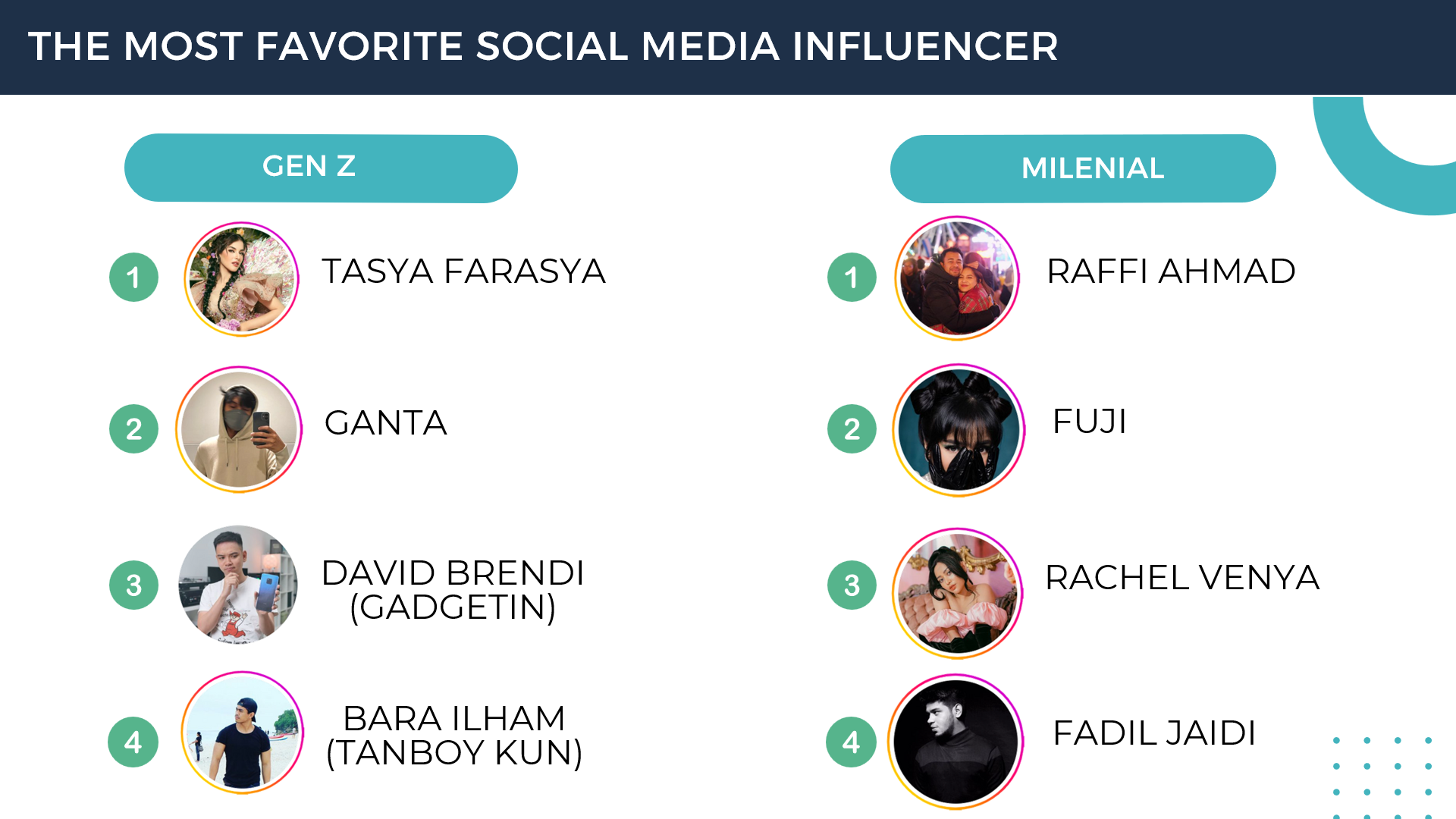 Gen Z mostly follows Tasya Farasya as a social media influencer, while millennials follow Raffi Ahmad the most.