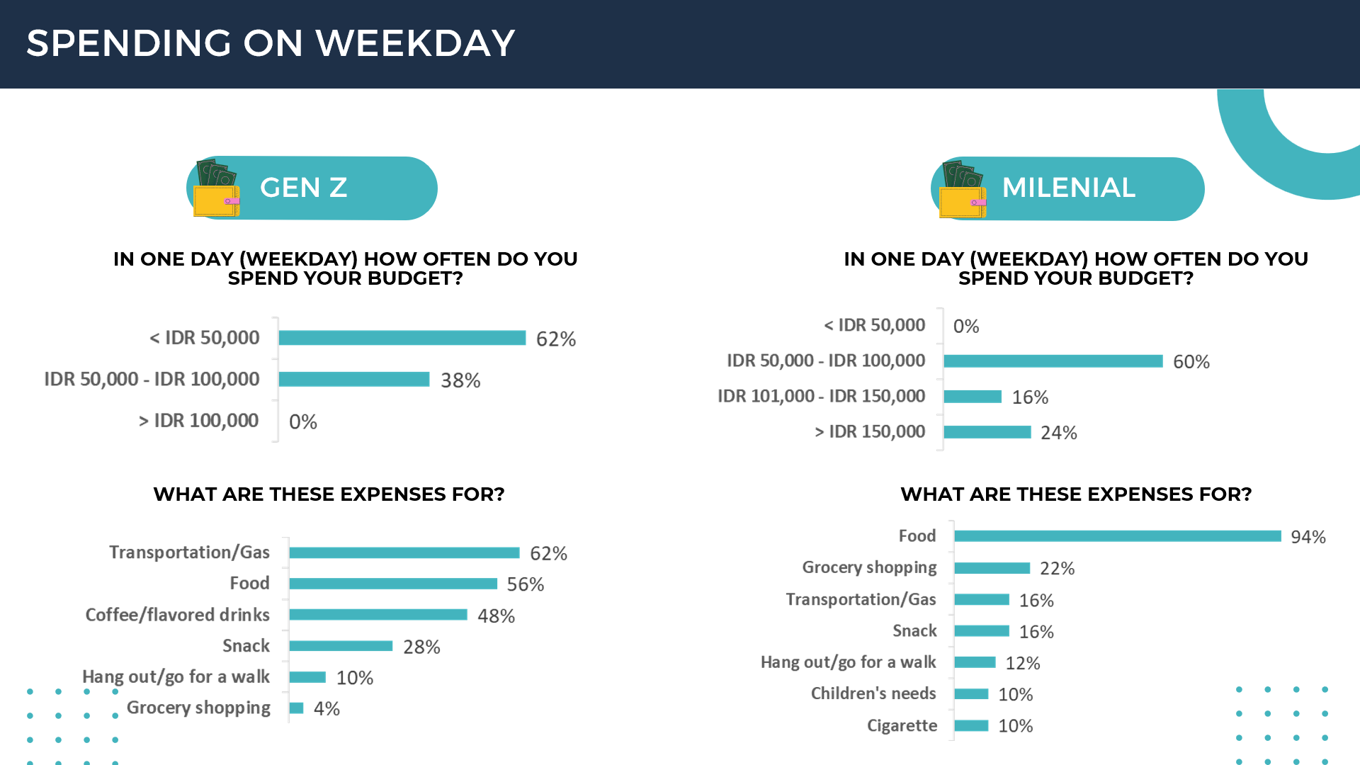 For the weekend, the expenditure of Gen Z and Millennials is almost the same, ranging from IDR 100,000 - IDR 200,000, mostly for hanging out.