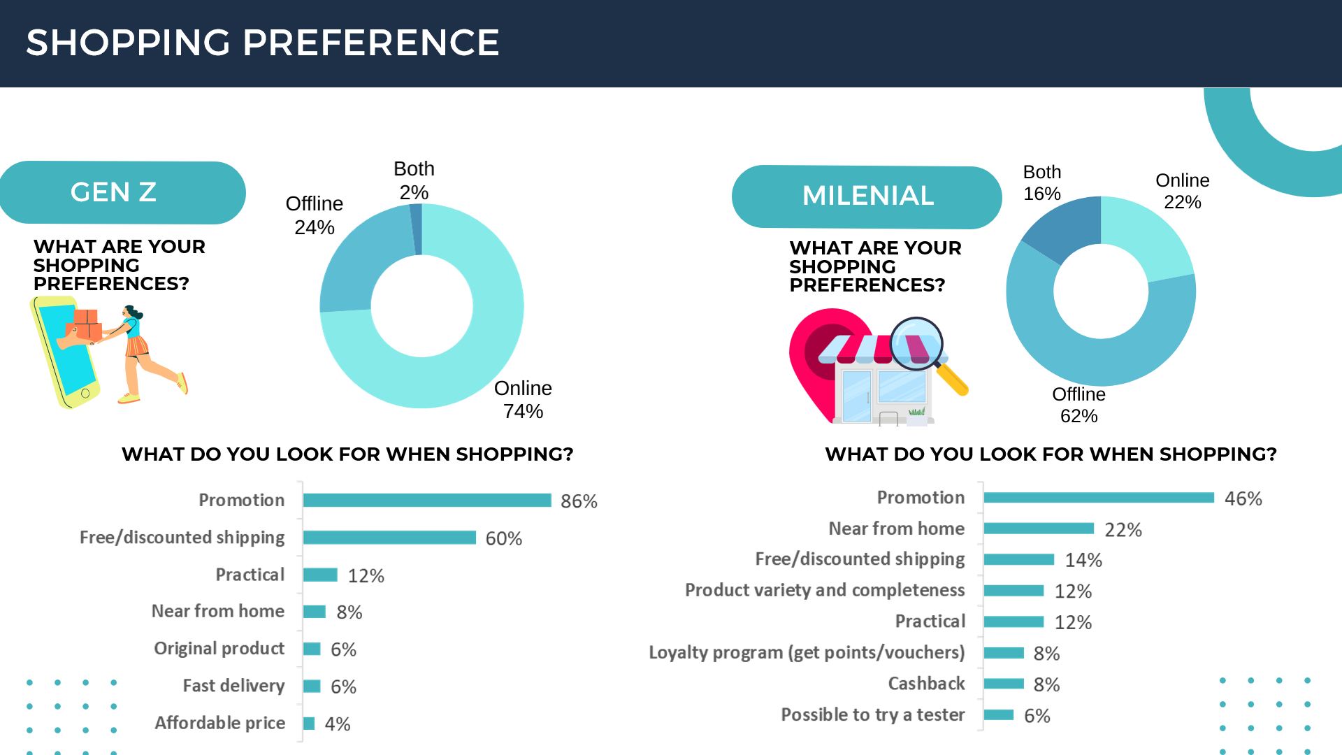 Gen Z prefers online shops because apart from lots of promotions there are also lots of discounts/free shipping, while millennials prefer offline shops because apart from lots of promos, the shops are close to home.