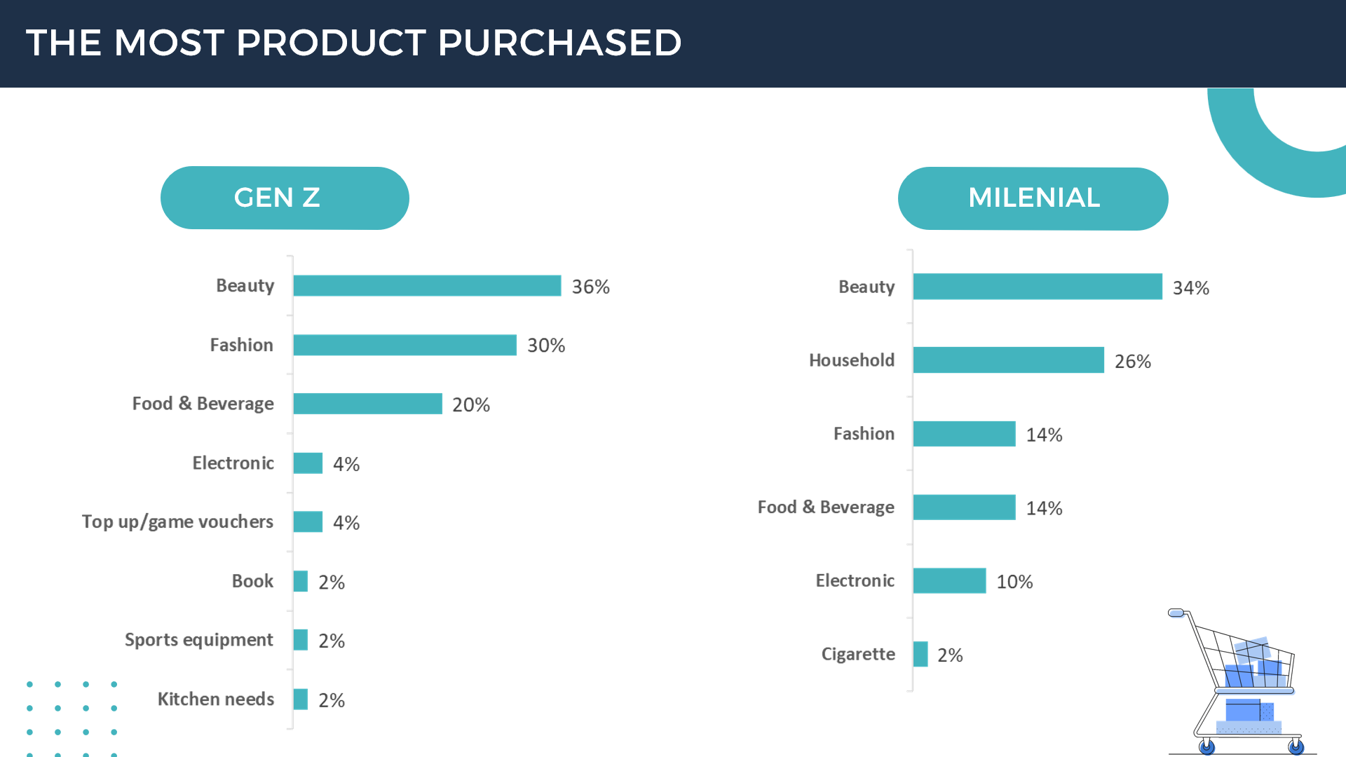 The product categories most purchased by Gen Z are beauty, fashion and food beverage. while the categories most purchased by millennials are beauty, household, and fashion.