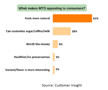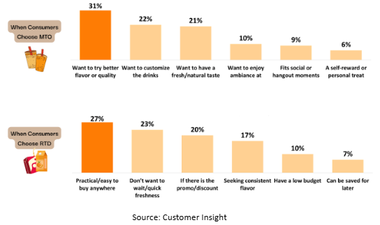 The behavior of MTO’s consumers reflects a broader desire for variety and novelty between MTO and RTD. While MTO offers freshness and customization, RTD provides convenience and quick access. Alternating between the two helps consumers balance excitement vs. practicality.