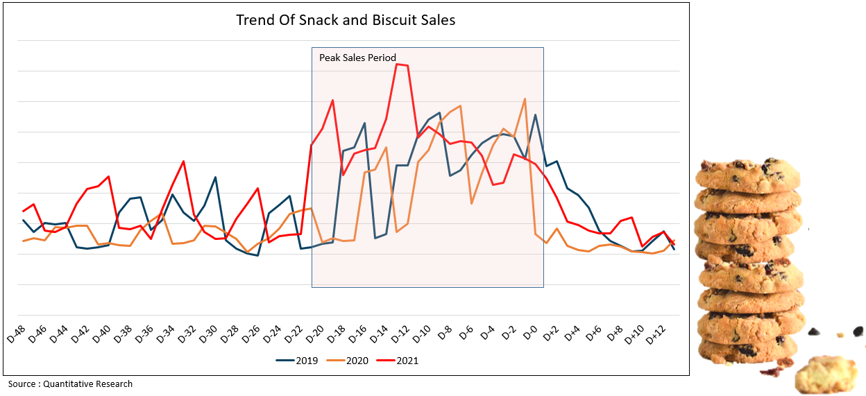 In the Snack and Biscuit category, the peak sales period happens from D-20 before Eid until D+3 after Eid. This is because snacks and biscuits are usually given as hampers for relatives before Eid and generally served during Eid to welcome family or guests.