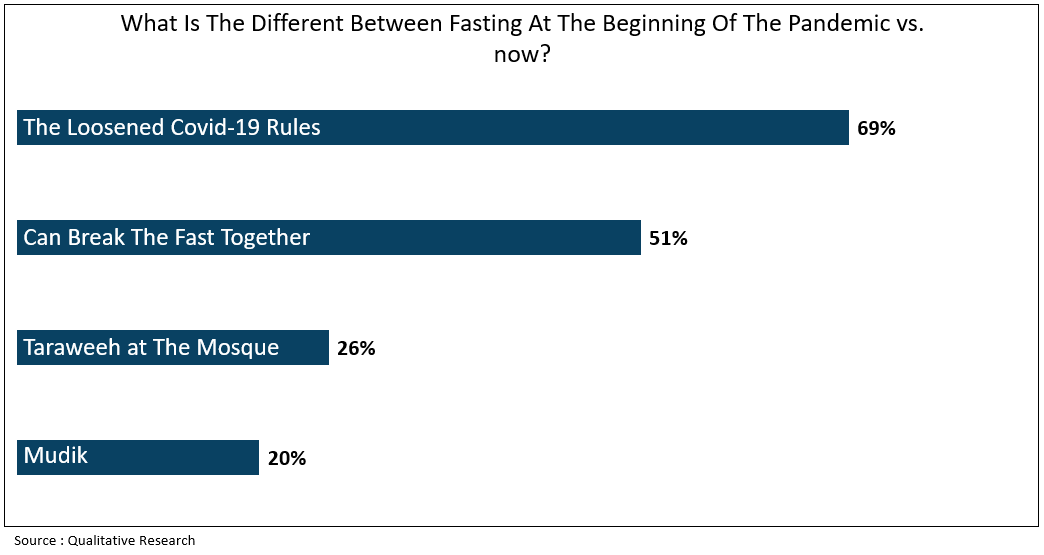Furthermore, are there any differences felt by the community related to fasting at the beginning of the pandemic vs. now? As we know, the Covid-19 pandemic officially entered Indonesia in March 2020. If we look back to 2020, the government implemented activities restrictions for the community. In addition, praying in mosques and mudik was not allowed at that time as a prevention to stop the spreading of the virus. In contrast to this year, they were able to break the fast together, Taraweeh at the mosque, and allow to mudik. Therefore, many felt that the government is loosening the regulations related to Covid this year.