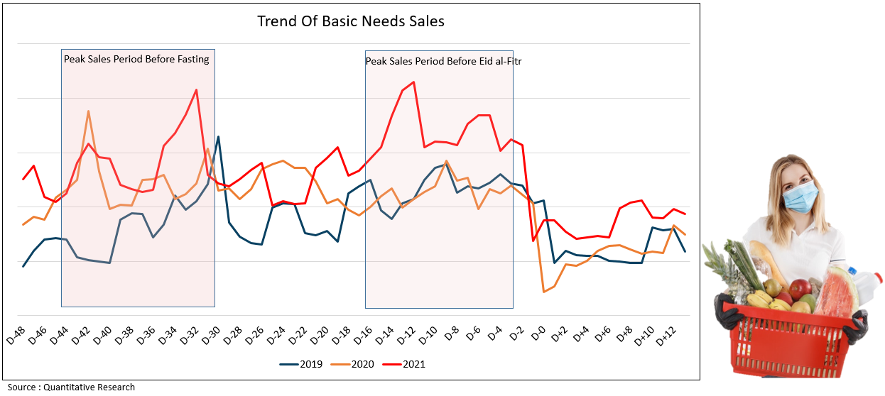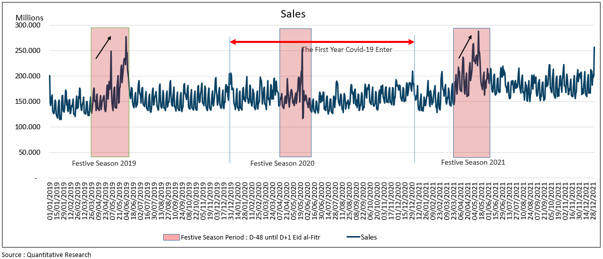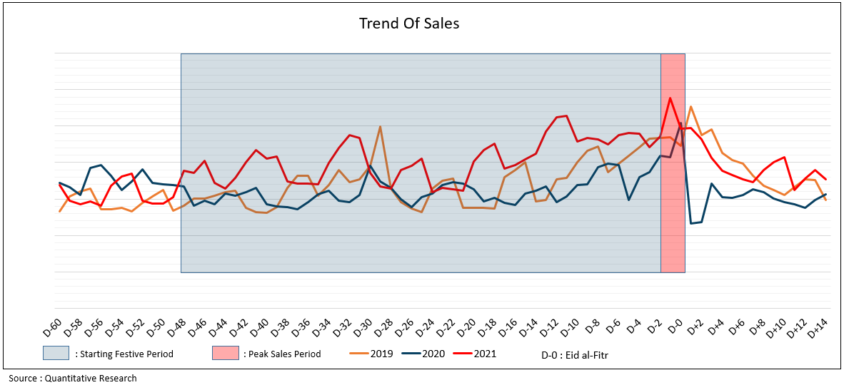 More specifically, the trend of sales at minimarket started to increase from D-48 before Eid. And the sales reach the peaks at D-2 before Eid until D+2 after Eid. In addition, in 2021, the sales showed significant growth compared to the last 2 years, which means that the economy is roaring back.