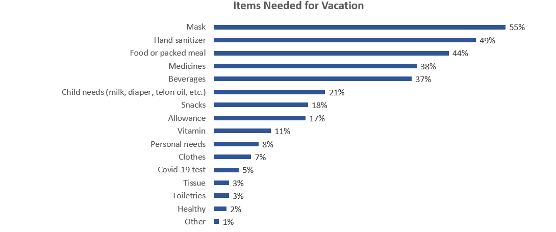 Furthermore, what items do you need to prepare for vacation during the pandemic? Survey showed that masks and hand sanitizer are mandatory items. In addition, people also prefer to prepare meals, drinks and bring some medicines by themselves. We hope these insights have been helpful for you, and if you want to know more about how to create opportunities based on data in the current situation? Feel free to have a discussion with us.