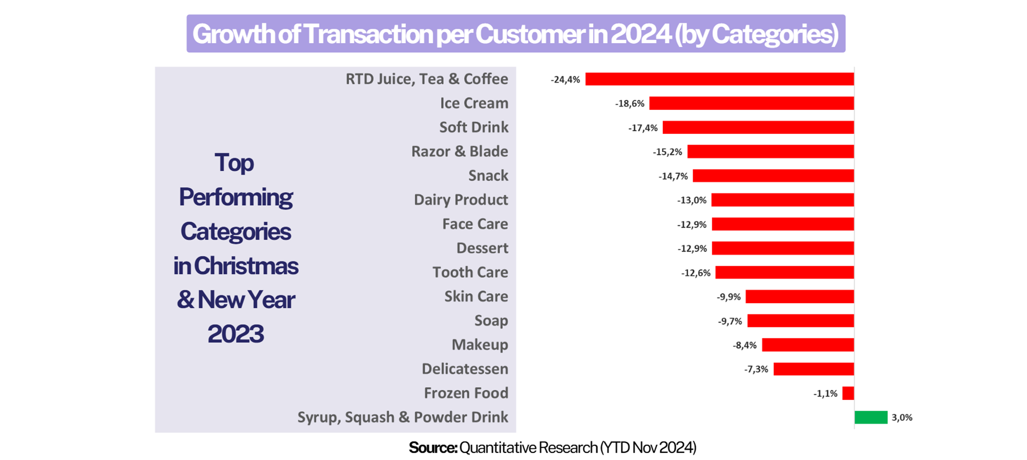 Before 2024 concludes, the remaining key events are Christmas and New Year holidays, which hold significant potential to drive sales. During Christmas and New Year 2023, daily sales in minimarkets experienced significant growth across various product categories, including personal care items (skincare, tooth care, face care, soap, makeup, razor, and blade), beverages (soft drink, RTD, syrup, squash, powder drink, and dessert), snacks, ice creams, dairy products (e.g. cheese, margarine, and butter), delicatessens (e.g. sausages, meatballs, and processed meat), and frozen food (e.g. chicken nugget, seafood, and frozen vegetables). Nevertheless, the current weakened purchasing power could affect the performance of these products during the upcoming Christmas and New Year season. By November 2024, transaction frequency per customer across most aforementioned product categories had declined, reflecting cautious spending behavior that could influence the forthcoming Christmas and New Year season.