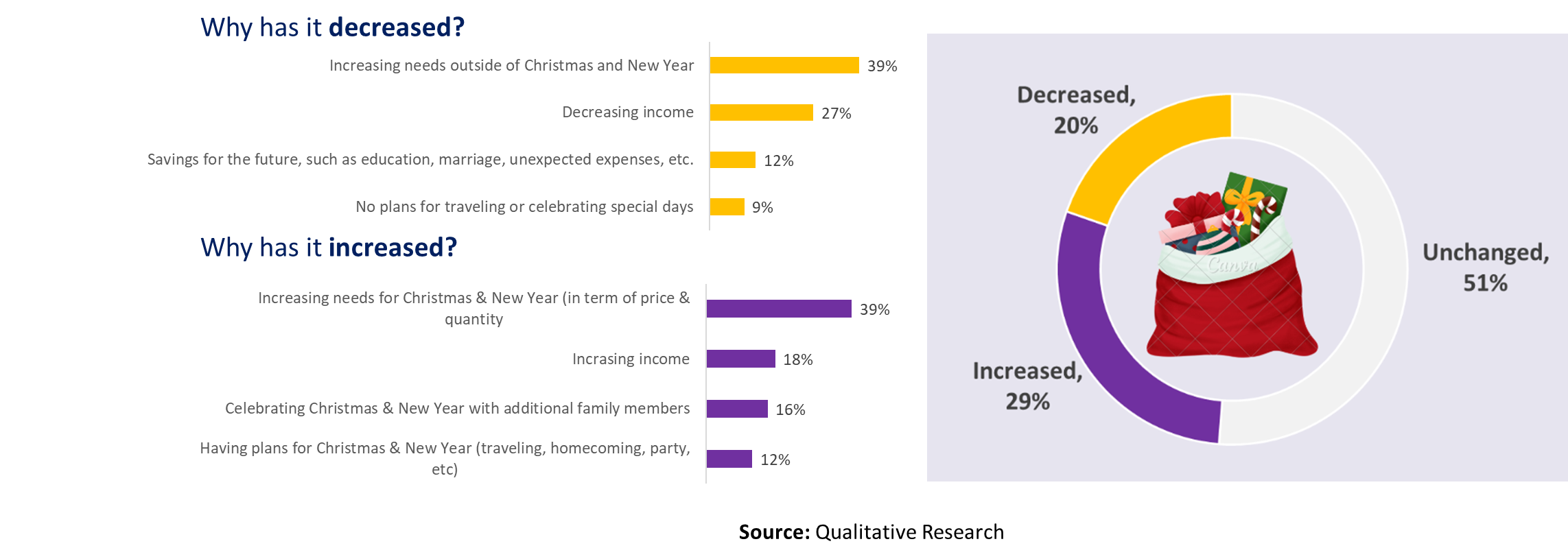 The current economic situation is indeed impacting consumers' ability to celebrate Christmas and New Year. To adapt while staying within their plans, they are adjusting their budgets by seeking more affordable alternatives, such as discounts and promotions. Additionally, to stay within their budget, they are reducing allocations for specific expenses (e.g. savings, homecoming, travel, parties, concerts, and grocery shopping).
