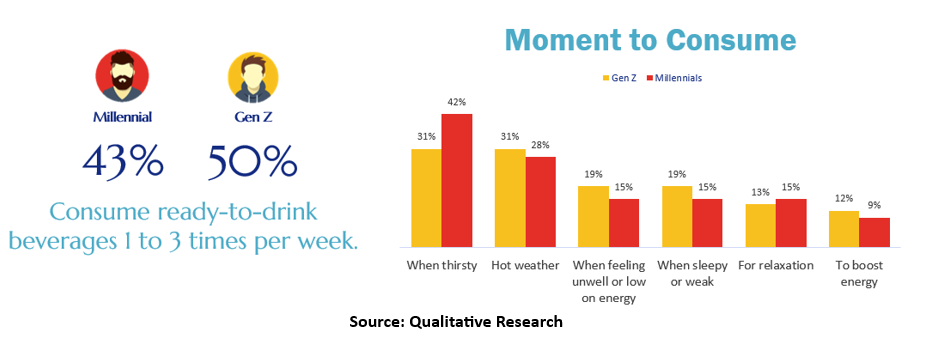 Gen Z and Millennials consume ready-to-drink (RTD) beverages 1 to 3 times per week, primarily for their functional benefits, such as quenching thirst and health improvements. Additionally, some appreciate the emotional satisfaction these beverages offer, valuing their convenience and enjoyment as part of their lifestyle.